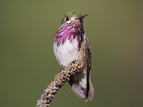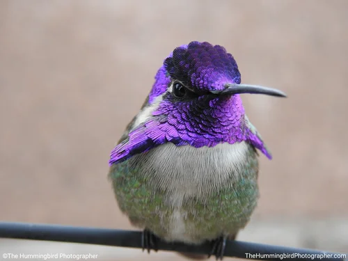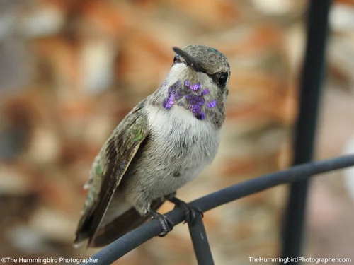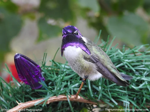 Male Costa's hummingbirds have a purple gorget that extends down the sides of their neck while females are all white with occasional small purple dots on their throat. All pictures were taken in Nevada and Arizona.
